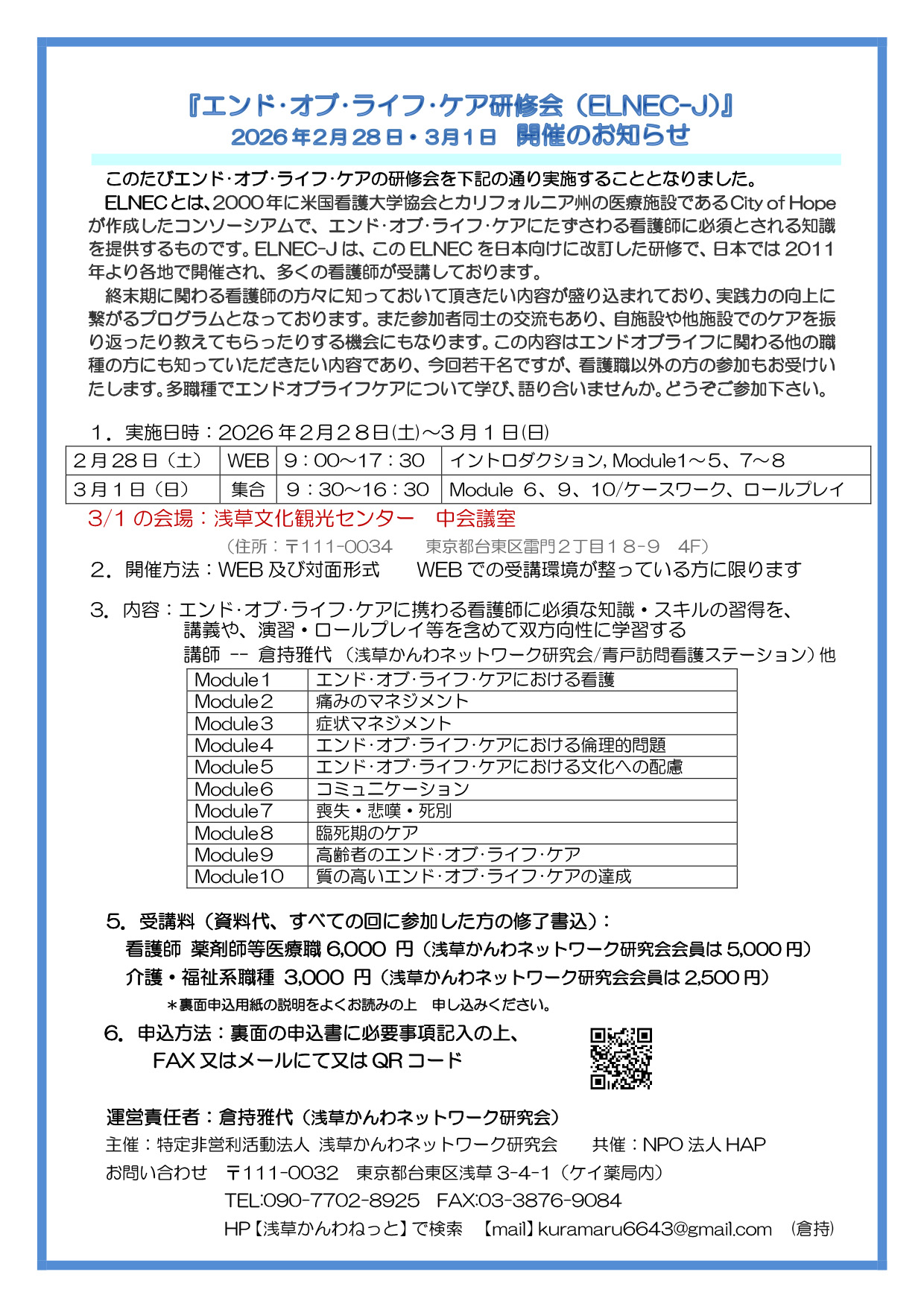 2026.02.28-03.01|エンド・オブ・ライフ・ケア(ELNEC-J)の研修会